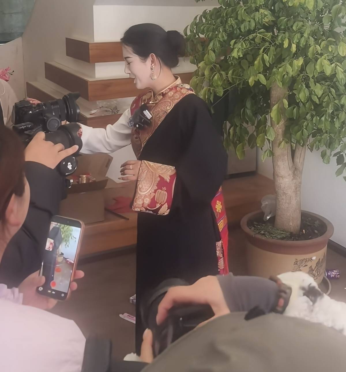 她穿了传统的藏族服装,戴了戒指耳环,把头发扎了起来,和平时镜头中的打扮差不多。